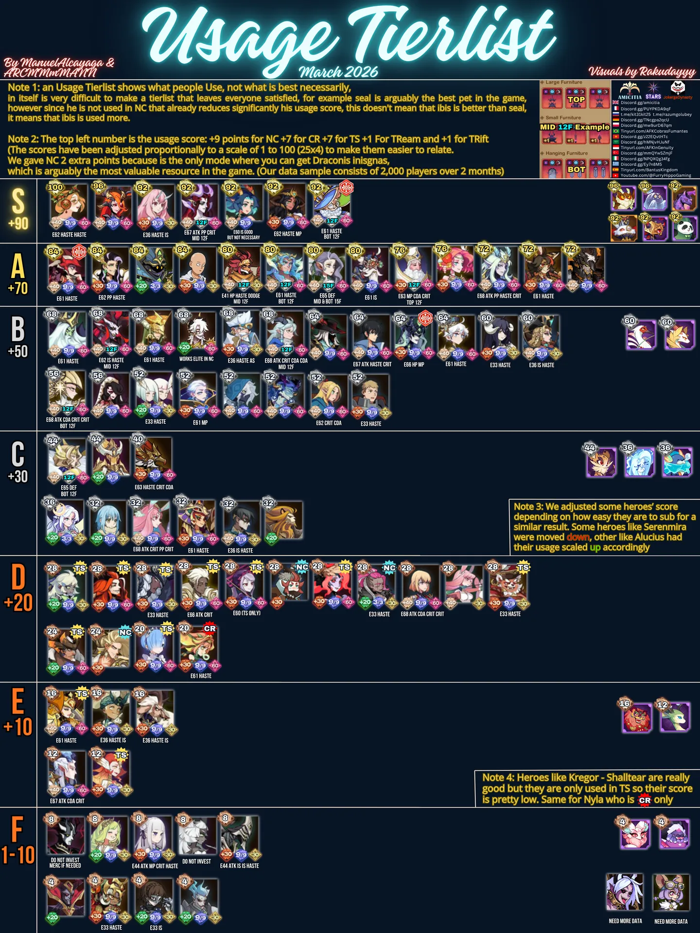 Данный Тирлист (март 2026) AFK Arena показывает, что люди используют, а не то, что лучше всего. Само по себе очень сложно составить Тирлист популярности героев, который удовлетворил бы всех. Например, питомец Тюлень, возможно лучший в игре, однако, поскольку он не используется в NC уже значительно снижает его показатель использования. Это приводит к тому, что питомец Ибис лучше Тюленя, так как используется чаще.