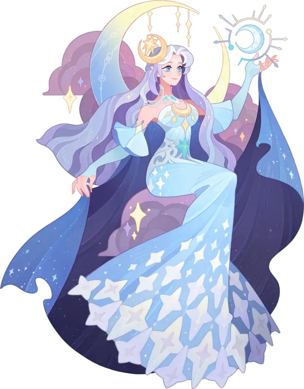 Богиня, рожденная из скорби и молитв смертных, она не подвластна ни заре, ни тени — к ней взывают те, кто ищут луч света в глубинах ночи. Она никогда не меняет судьбу, ни во что не вмешивается. Она просто безмолвно сияет — в ее свете становятся зримы слезы сирот, решимость солдат и покой стариков.