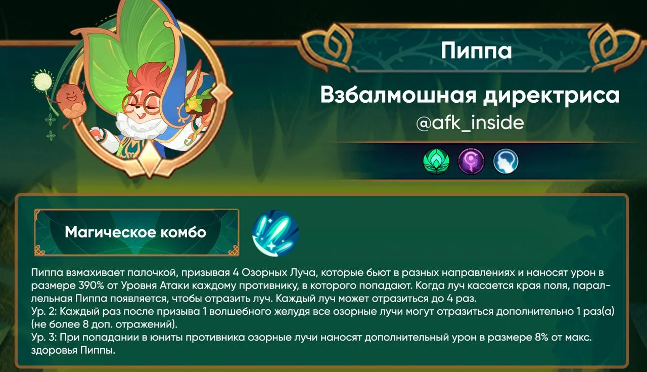 Главная » НовостиАнонс Пиппа — Взбалмошная Директриса Новости Автор afkadmin На чтение 1 мин Просмотров 16 Опубликовано 23.01.2026Пиппа — Взбалмошная Директриса — из фракции Лесные Жители, атрибут Интеллект, класс Маг.Навыки