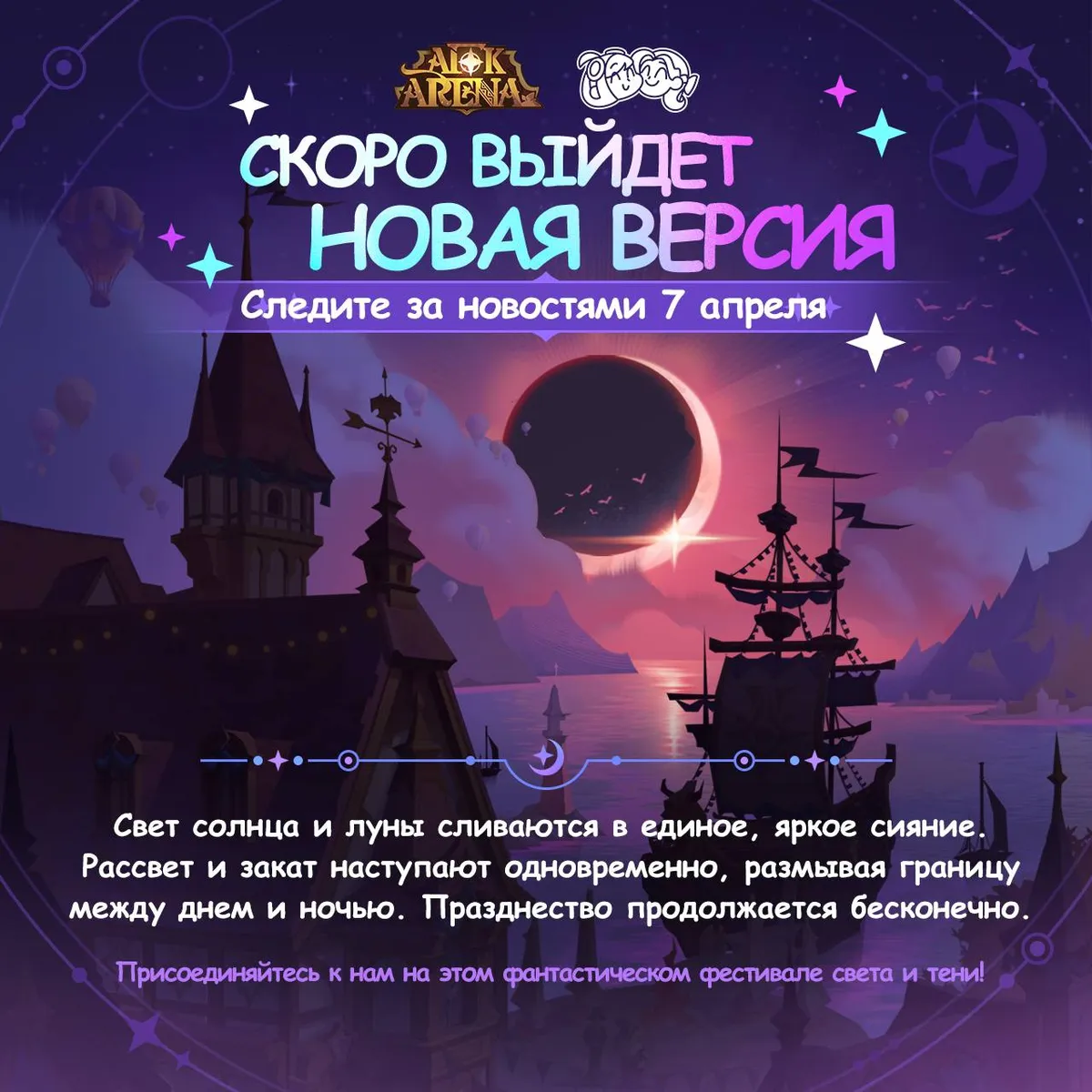 Главная » НовостиАнонс событий предстоящей годовщины Автор afkadmin На чтение 1 мин Просмотров 39 Опубликовано 30.03.2026Свет солнца и луны сливаются в единое, яркое сияние.Рассвет и закат наступают одновременно, размывая границу между днем и ночью.Празднество продолжается бесконечно…Присоединяйтесь к нам на этом фантастическом фестивале света и тени!