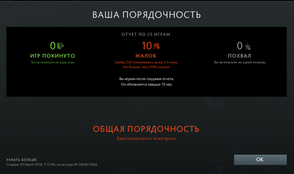 Порядочность в доте — это число, которое отражает уровень вашего поведения. Оно может быть очень высоким (и тогда вас будут окружать преимущественно адекватные тиммейты), или низким (и вот тогда вы попадёте в клуб «Добро пожаловать в low priority»).