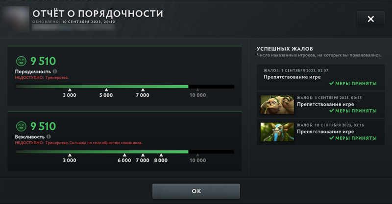 - Анализ собственных ошибок. Подумайте, за что могли кинуть репорт вам. Может, вы слишком эмоционально реагируете? Исправьте это — и графа порядочности поползёт вверх.